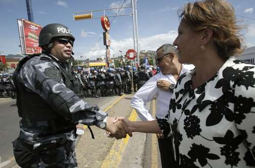 Xiomara Castro, esposa del presidente constitucional de Honduras, Manuel Zelaya, saluda a un oficial tras participar en una marcha de la resistencia