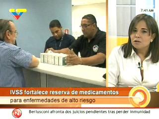 La directora del servicio de farmacoterapéutica del IVSS, Verónica Crespo, informó que en marzo de este año se hizo una compra programada de medicamentos con una inversión de dos mil 400 millones de bolívares, destinada a cubrir un año de tratamiento para patologías como cáncer, artritis, esclerosis, transplante y deficiencia de hormonas de crecimiento, entre otras hasta marzo del próximo año.