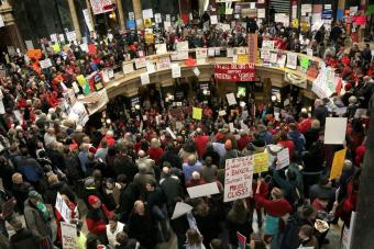 Los manifestantes acusan a los legisladores y en particular a los gobernadores, de aprovecharse de la crisis del presupuesto para destruir a los sindicatos, entre otras razones para eliminar su apoyo sistemático al Partido Demócrata durante los procesos eleccionarios.