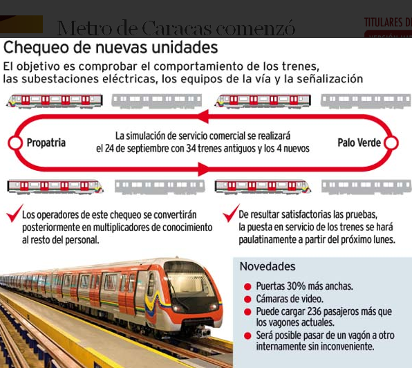 21/09/11.- Desde el pasado 16 de septiembre la Gerencia de Operaciones de la C.A. Metro de Caracas comenzó a realizar pruebas con 4 de los 5 trenes nuevos que ya se encuentran en el país.