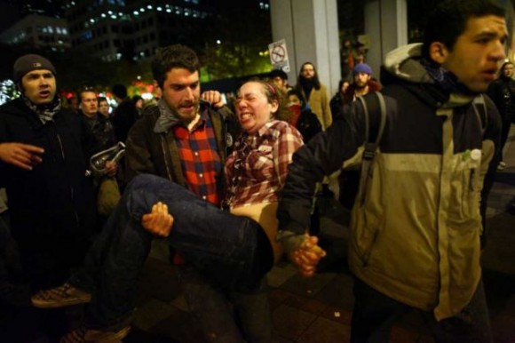 Una mujer que se identificó como Jennifer y dijo que estaba embarazada de dos meses se precipitó a una ambulancia después de ser golpeado con el spray de pimienta en la protesta Occupy de Seattle el Martes, 15 de noviembre 2011 en Westlake Park.Una mujer de 84 años de edad también fue víctima del aerosol