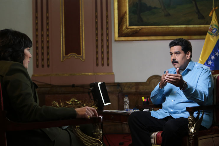 La entrevista, emitida en inglés, se hizo un día después del primer aniversario de la muerte de su predecesor, Hugo Chávez, y tras un mes de protestas en contra de la inseguridad y de la escasez que han sacudido Venezuela, consideradas por el mandatario como un golpe de estado en ciernes y que llevó a la expulsión de tres diplomáticos estadounidenses acusados de colaborar en un supuesto sabotaje con la oposición.