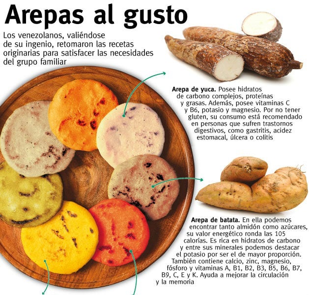 Las croquetas de garbanzos, berenjenas guisadas y hasta vegetales salteados a la vinagreta, son algunos de los tantos ejemplos ingeniosos de la población para garantizar en su mesa las tres principales comidas del día. Esto sin contar las coloridas arepas de yuca, auyama y hasta de remolacha que aseguran, además, el histórico plato tradicional "que no es a base de harina precocida como se nos impuso, sino de maíz pilado, el cual contribuye enormemente con la ingesta de nutrientes imposibles de obtener en ningún tipo de alimento procesado".