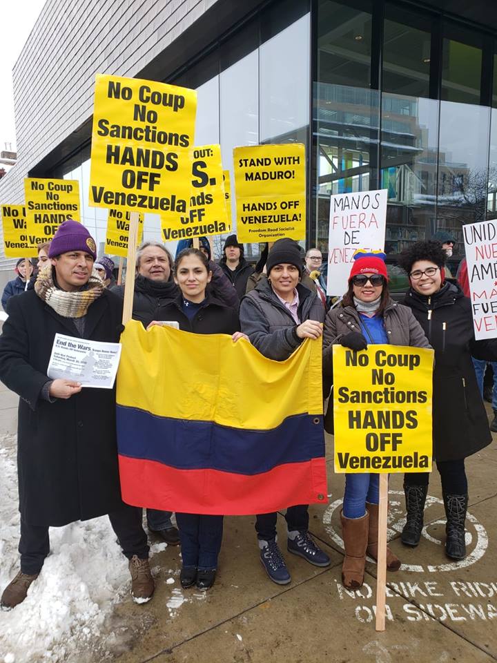 Desde el estado de Minnesota, EEUU, se reporta un grupo de colombianos que se suman al movimiento internacional en defensa de la soberanía venezolana "Hands off Venezuela". Varios activistas entre ellos el líder sindical y defensor de los derechos humanos, Gerardo Cajamarca exigen al gobierno de EEUU y de Colombia sacar sus garras de Venezuela así como respetar su soberanía.