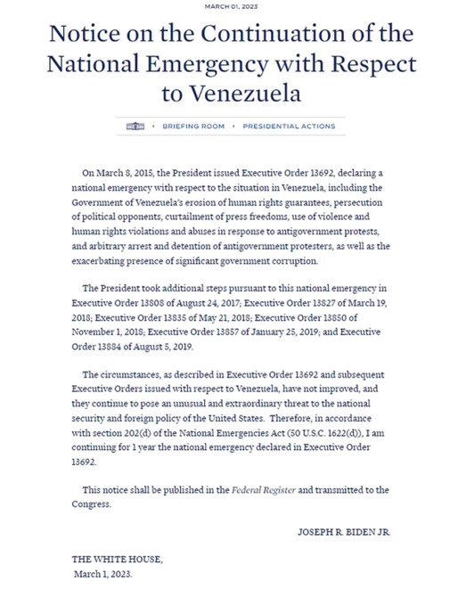 02-03-23.-El presidente de Estados Unidos, Joe Biden, prorrogó este miércoles el decreto que califica de emergencia nacional en Venezuela, al considerar al país una "amenaza para la seguridad nacional y la política de exteriores" estadounidense. El decreto se renueva cada año desde su implantación el 8 de marzo de 2015, y en el comunicado del presidente Joe Biden explica que "las circunstancias" descritas en la orden inicial "No han cambiado".