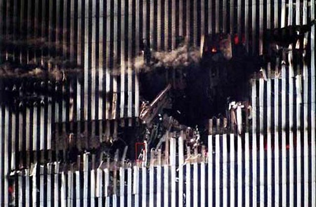 Esta es una de la tantas pruebas de lo imposible y mentirosa de tal aseveración. Una mujer pide auxilio asomándose a la abertura dejada por el impacto del "avión". Allí no había "un infierno de calor", así lo dijeron también los bomberos mártires que trabajaban en la zona de impacto, ellos decían que tenían casi controlado el incendio y prestaban ayuda a los heridos, cuya grabación, de más de una hora, solo "apareció" un año más tarde.