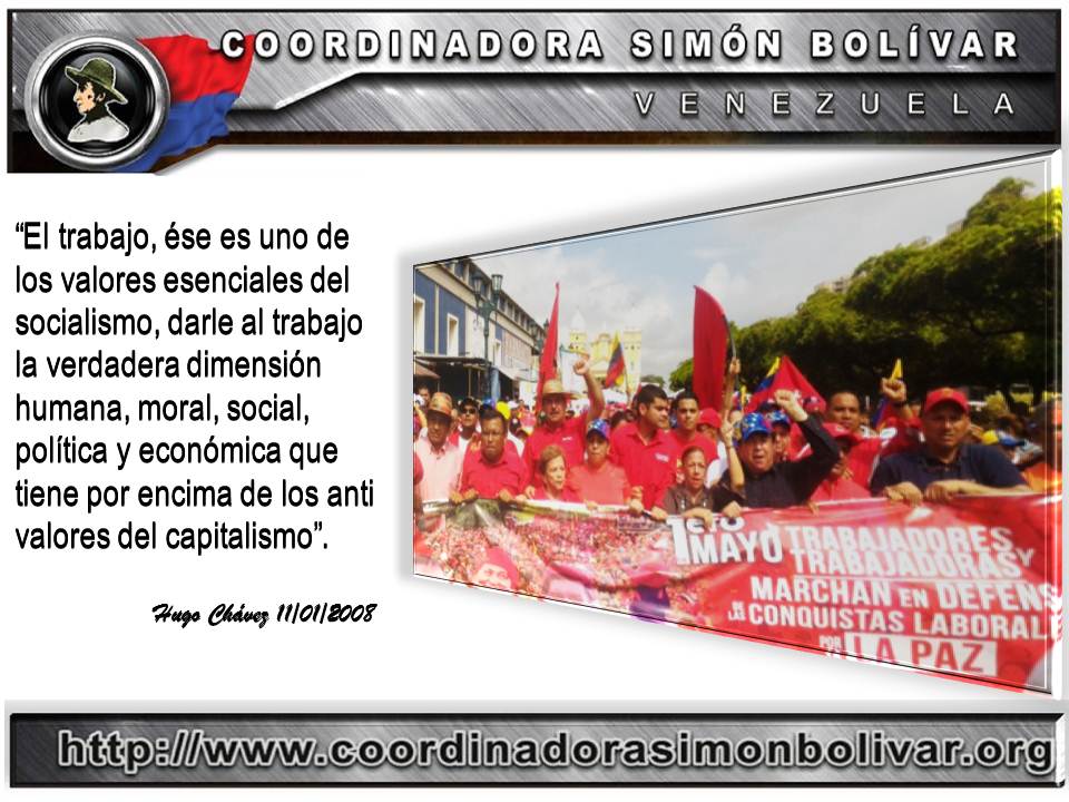Este Primero (1ro) de mayo, La Coordinadora Simón Bolívar como Organización Social de Base que expresa y defiende los ideales bolivarianos, envía un saludo fervoroso a las trabajadoras y a los trabajadores del mundo, y en especial a los de Venezuela, suelo patrio de nuestro insigne Libertador Simón Bolívar.