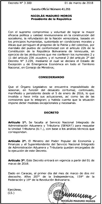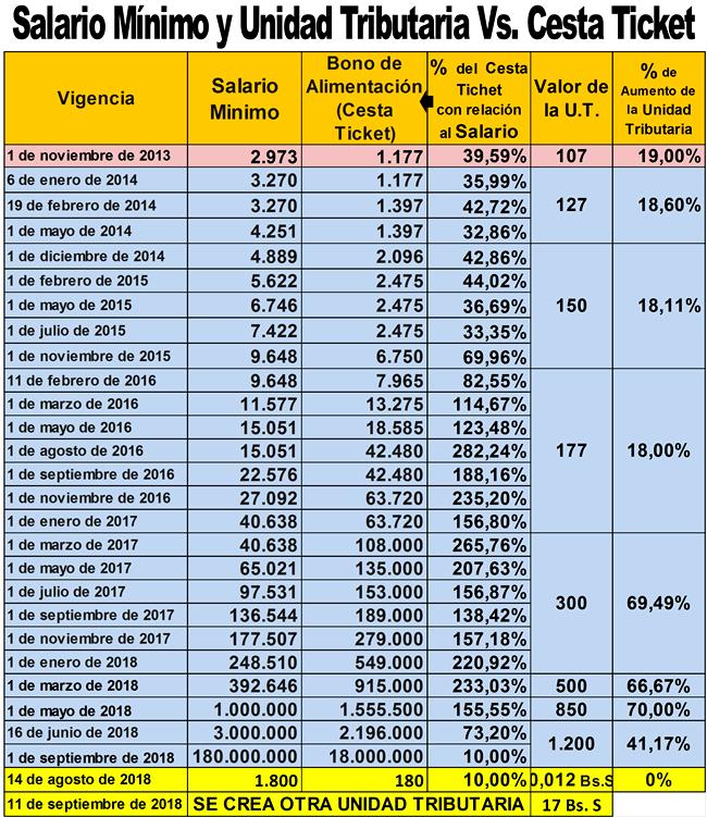 De acuerdo a la Tabla arriba citada, la realidad de la crisis del Presupuesto Familiar que también depende del Cesta Ticket, en este año 2018, obligó al gobierno por primera vez a aumentar tres (3) veces la Unidad Tributaria vía Decretos Presidenciales en un mismo año: una el 1° Marzo de 500 Bs.F , otra el 30 de Abril de 850 Bs.F y una tercera al 20 de junio de 1.200 Bs.F que significaron aumentos porcentuales en la Bonificación del Salario, en este mismo orden, de 66,67 %, 70% y 41,17%. El último aumento de la U.T. de 1.200 Bs. F quedó congelada, coincidiendo con la instauración del Nuevo Cono Monetario para convertirse en 0,012 Bs. Soberanos (1.200 Bs. F) y siguió vigente como referente y a una distancia de años luz para el cálculo del Cesta Ticket.