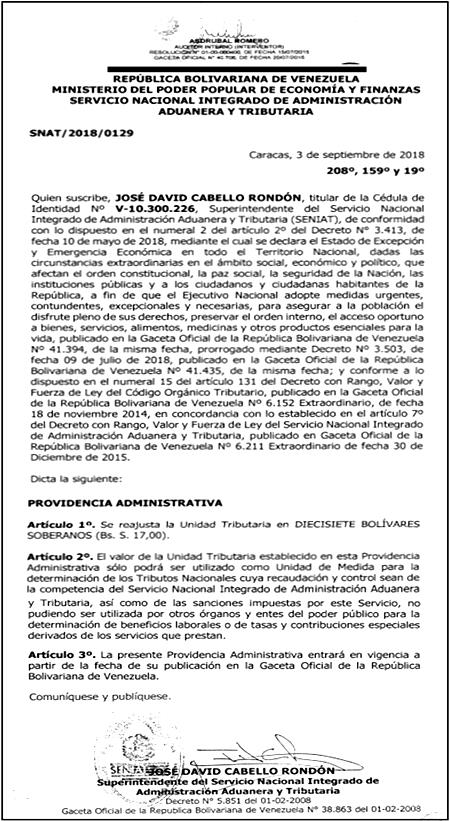 Y decimos que quedó congelada en 0,012 Bs. S, porque paralelo a lo anterior, se creó por PRIMERA VEZ una Nueva Unidad Tributaria de 17 Bs.S vía Decreto Presidencial del 1° de Marzo[xi] y que el Seniat fijó a través de una Providencia Administrativa el 3 de Septiembre (6 meses después)[xii], la cual representa una diferencia porcentual exorbitante de 141.666,66% con relación a la Unidad Tributaria Ordinaria vigente de 0,012 Bs.S.