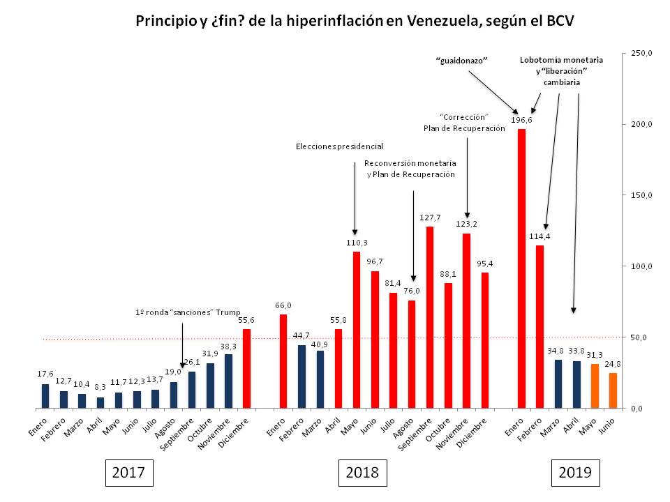 A mi modo de ver, el acelere del ritmo de crecimiento de los precios que degeneró en el rallyhiperinflacionario, resultó principalmente –que no exclusivamente– de la onda expansiva causada por la primera ronda de sanciones de Trump en agosto 2017, de la cual se vivieron secuelas y agregaron refuerzos durante todo 2018. Posteriormente, dicho rally alcanzó un pico durante las presidenciales de mayo 2018, para tomar un significativo reimpulso tras la reconversión monetaria y el Plan de Recuperación de agosto 2018 –en su primera versión– y de noviembre 2018, en su segunda versión "corregida".