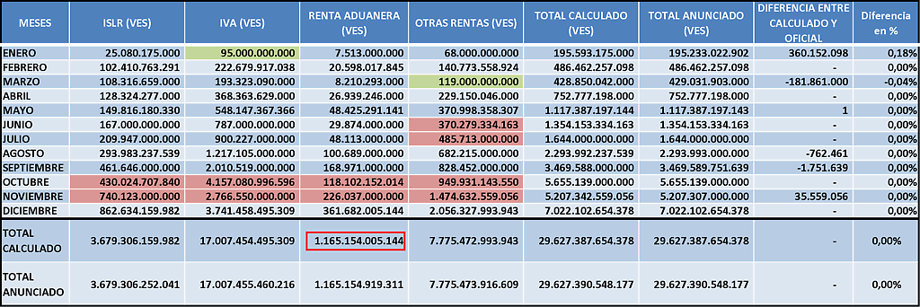 Lo que si sabemos por los datos que aporta el Seniat, vía twitters y declaraciones de prensa[ii], porque ya en su página web no aparecen las Estadísticas (como debe ser), es que solo la recaudación anual más baja del Seniat 2019 que corresponde a la Renta Aduanera Total 2019 alcanzó a 1.165.154.005.144 Bs.: una cifra cercana al monto total estimado del PPN-2019. Ver tabla de recaudación de este impuesto por mes durante todo el año 2019: