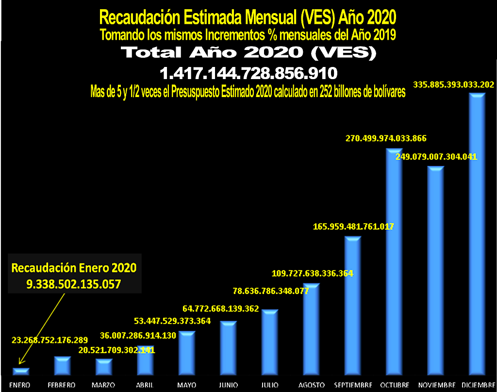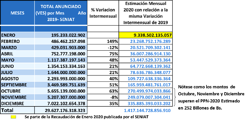 Ahora, si el comportamiento de la Recaudación Mensual Seniat 2019 se mantiene en el Año 2020 y tomamos como referencia lo recaudado en el Mes de Enero 2020 (en amarillo en la gráfica anterior), al multiplicarlo por 35.9 nos daría la impresionante cifra: 9.338.502.135.057 x 35,9 = 335.252.226.648.546 bolívares para el mes de Diciembre 2020. ¡Una cifra que superaría en 83 Billones el monto oficial estimado del PPN-2020 de 252 Billones!