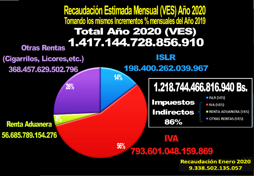 Para ello, tomemos la reciente Recaudación Seniat Enero 2020[viii] que alcanzó la exagerada cifra billonaria de: 9.338.502.135.057 de bolívares y veamos los totales "billonarios" de sus componentes: