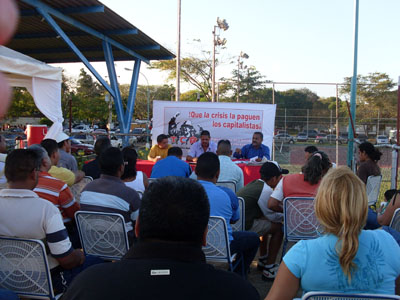 En este sentido se enfatizó que esta crisis económica mundial ya está teniendo sus repercusiones en el país, y su impacto será cada vez mayor. Por más que el gobierno haya querido minimizar su impacto en medio de la campaña electoral para la Enmienda Constitucional, ya ha comenzado a decir que "va ser duro" el impacto, anticipando las medidas que seguramente va a tomar. Los compañeros expusieron que el impacto claro lo evidencian, en primer lugar, la fuerte caída de los precios del petróleo, cuyo barril llegó a estar en 140 dólares y ahora ha bajado casi a 30 dólares; en segundo lugar, por primera vez en años la producción ha caído fuertemente en el marco de una creciente inflación; y en tercer lugar, que los despidos ya están llegando. Pero los trabajadores comienzan a resistir, como se observa en la oleada de conflictos que se vienen desarrollando contra los bajos salarios, por el convenio colectivo y contra los despidos, donde la lucha más emblemática al momento es la de los obreros de la Mitsubishi, quienes se opusieron y se oponen al despido de más de 135 trabajadores tercerizados, pero que han tenido como respuesta una violenta represión a manos de la policía del estado Anzoátegui, dejando el saldo de dos obreros muertos.