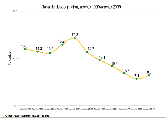 21 e septiembre de 2009.- La tasa de desocupación se ubicó en 8,0 % en el mes agosto de 2009, según se desprende del Informe Mensual de la Fuerza de Trabajo correspondiente al séptimo mes del año, elaborado por el Instituto Nacional de Estadística (INE).