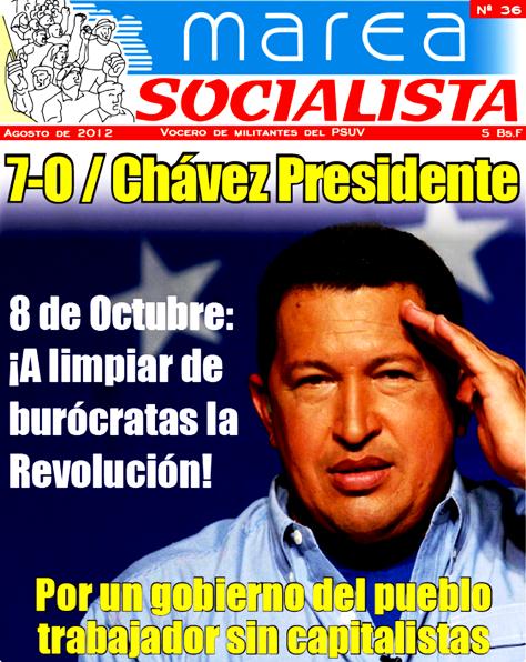El periódico Marea Socialista Nº 36 (agosto de 2012) viene con un afiche de Chávez en la portada y con el mensaje: El 7-0 ¡Chávez Presidente! El 8-0 ¡A limpiar de burócratas la revolución!  La consigna de Marea Socialista para el próximo gobierno del Comandante es: ¡Por un gobierno del Pueblo Trabajador sin capitalistas!