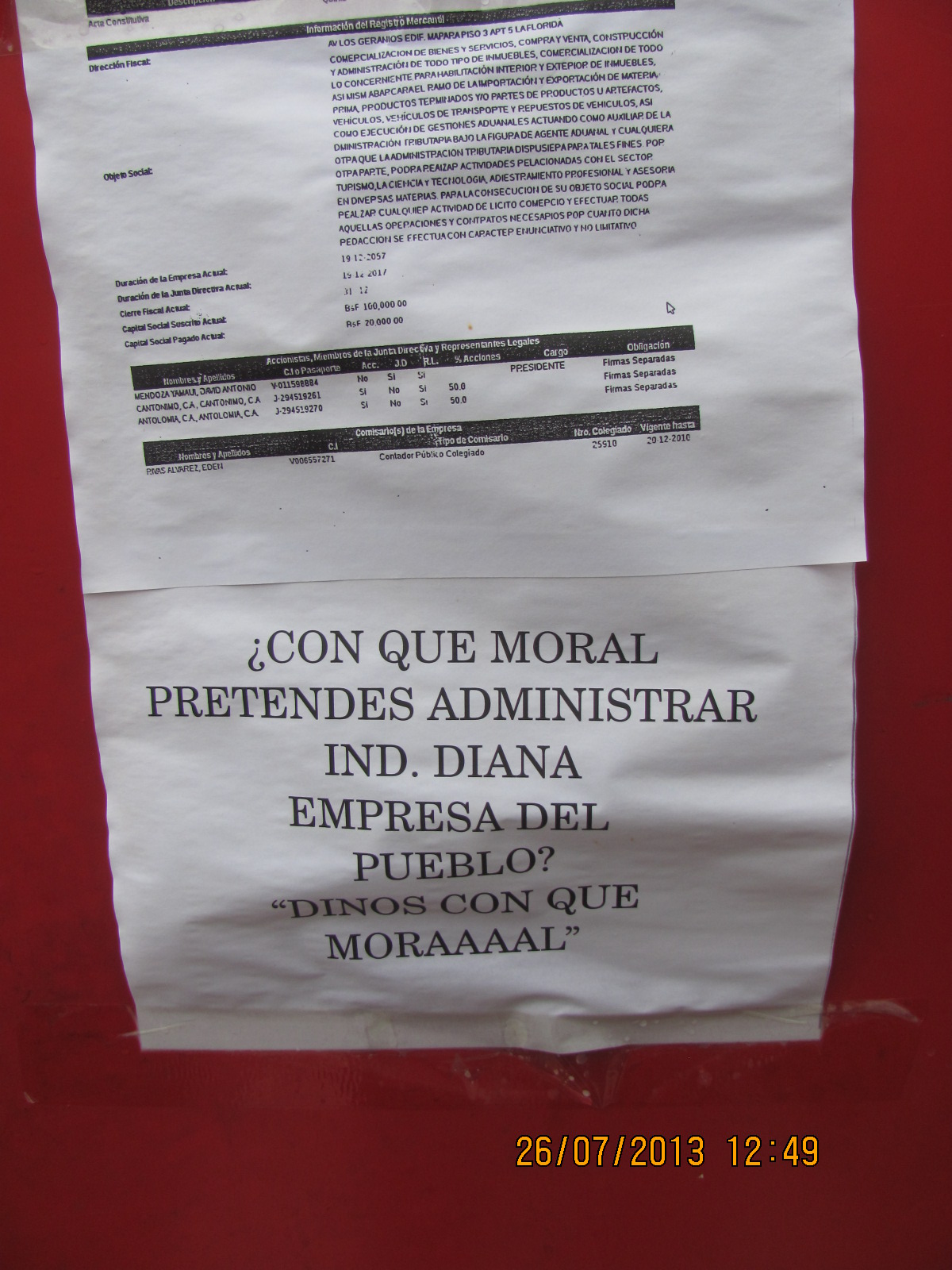 El pasado martes 23 de junio fue publicado en Gaceta Oficial[1] un acta notariada ante el Registro Mercantil Primero del estado Carabobo de fecha lunes 22 de julio de 2013. En ella, el ministro de alimentación Félix Osorio, en función de sus atributos conferidos como representante del 100% de las acciones del capital de la empresa Industrias Diana C.A. para convocar la asamblea de accionistas sin notificación previa y además la de “nombrar y remover el Gerente General y los demás miembros de la Junta Directiva”, ha impuesto remover al Sr. Ángel Orsini del cargo mencionado y nombrar en el mismo, sin aviso ni protesto, al Sr. David Mendoza, y a los Sr(s) y Sra(s) Mariana Josefina Rodríguez Hernández, Erich Nailen Escalante Moncada, Andy Tovar Veliz y Domingo Salcedo Valladares, como miembros principales de su Junta Directiva. El acta reza “En el día de hoy lunes veintidós (22) de julio de 2013, siendo las 9:00 a.m., encontrándose reunidos en la sede social de la empresa del Estado Industrias Diana, C.A. …”. El único hecho cierto es que en esa fecha, y en esa hora o cualquier otra del mismo día, no hubo ninguna asamblea de accionistas en Diana, ni tampoco Osorio ha estado desde su investidura como ministro en la sede social de la empresa.