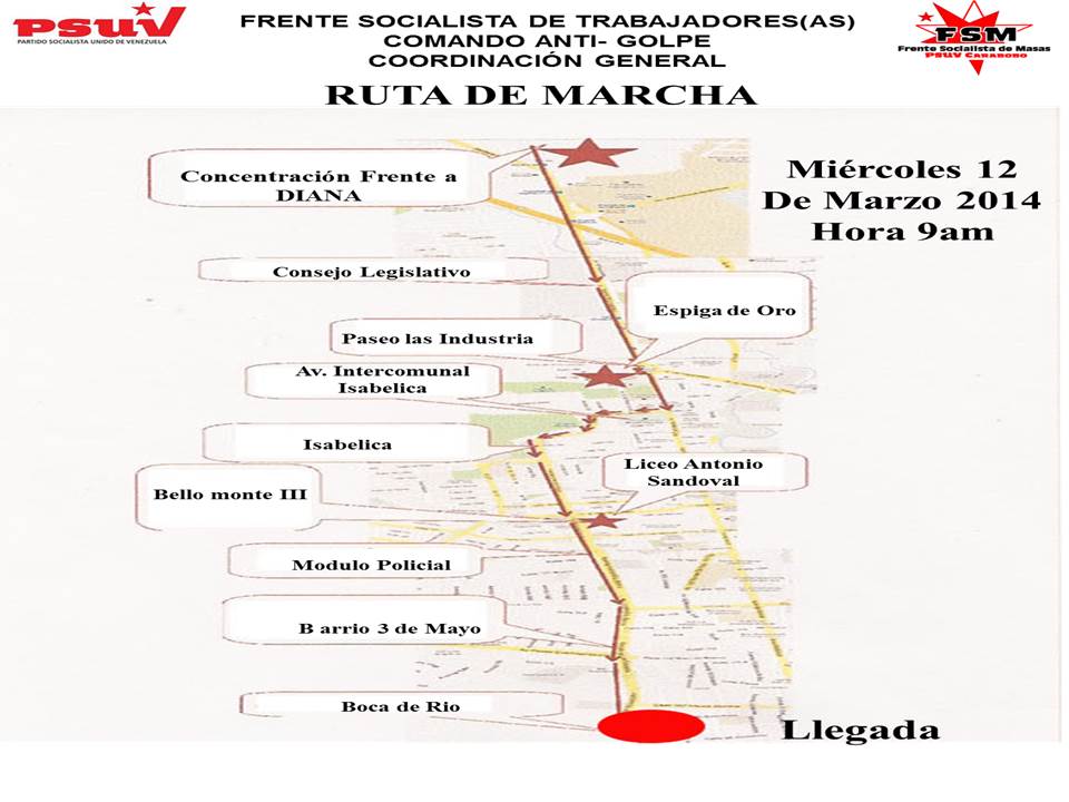 El próximo Miércoles 12 de marzo a partir de las 9am el frente de trabajadores anti golpe del Estado Carabobo, que agrupa a los sindicatos, consejos de trabajadores, delegados de prevención nos concentraremos frente a la empresa DIANA ubicado en la Av. Henry ford para marchar hasta Boca de Rio, para decirle a los golpistas y sus lacayo que no pasaran sus intenciones de que por la vía de la violencia derrotaran a este proceso revolucionario.