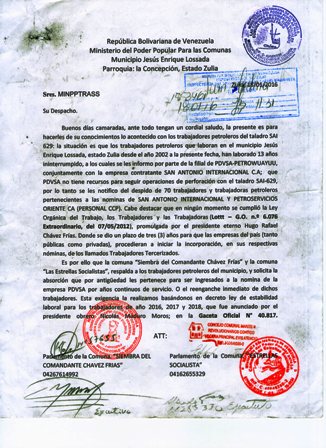Los trabajadores han recibido la solidaridad, incluso de dos comunas socialistas del estado Zulia; la Comuna Siembra del Comandante Chávez Frías y la Comuna Las Estrellas Socialistas quienes solicitan se considere el reengache de los trabajadores ya que han trabajado más de 13 años de manera initerrumpida en el Taladro SAI-629.
