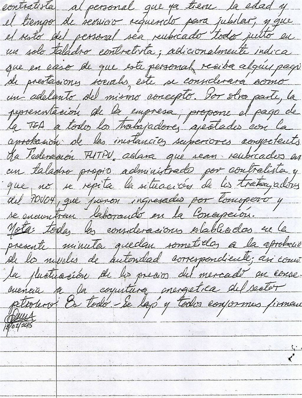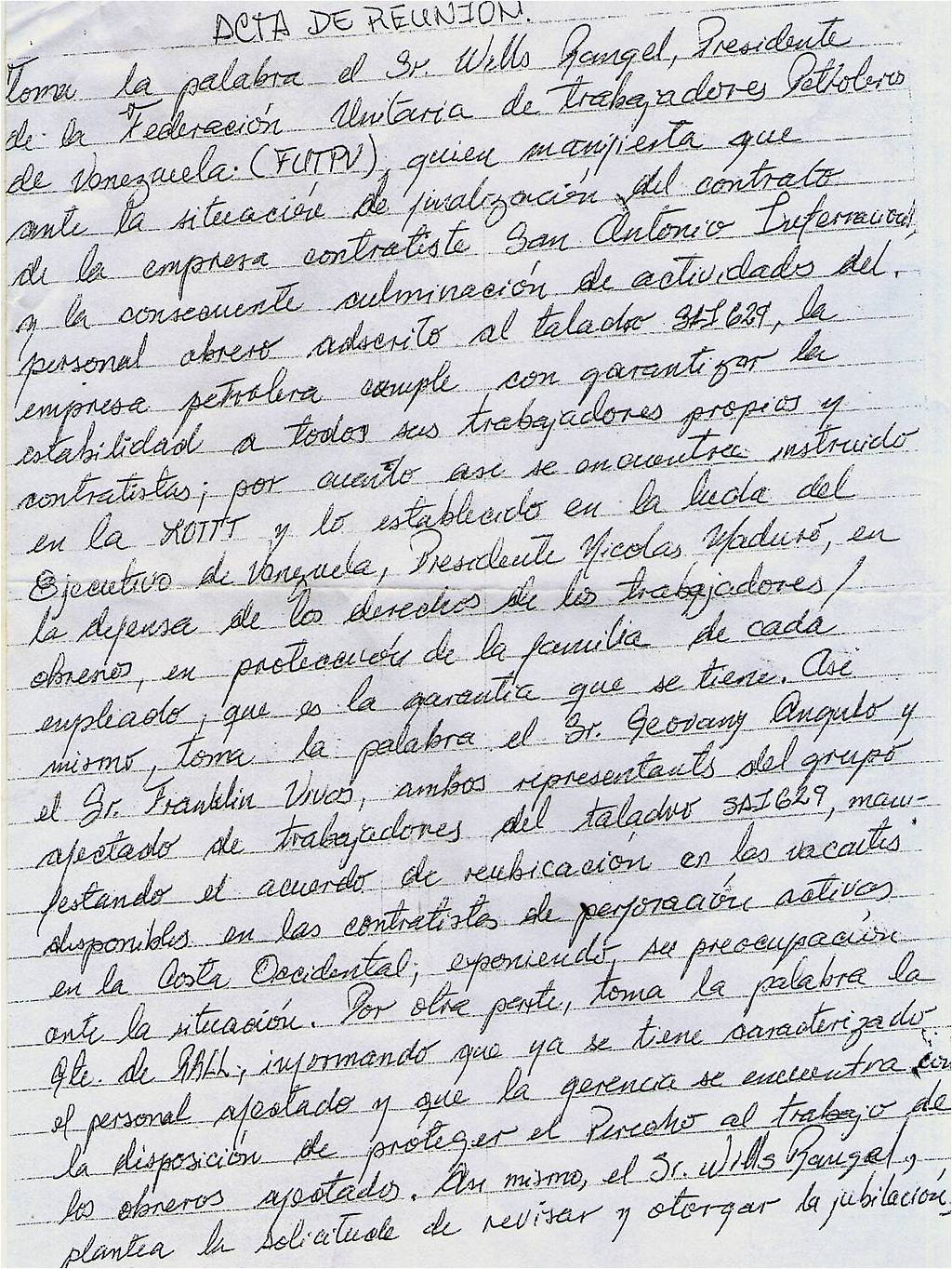 Juan Villasmil declara ante este medio "Esto fue un despido injustificado que se salta toda la normativa alcanzada en la Ley Orgánica del Trabajo. Hemos hecho todas las diligencias pertinentes para que se nos resuelva esta calamitosa situación. Tenemos un acta que fue firmada por Wills Rángel, Presidente de la Federación Unitarias de Trabajadores Petroleros de Venezuela, y lo que ha hecho es gurdar silencio ante esta violación de los derechos laborales de 72 padres de familia que nos quedamos sin poder llevar el pan a nuestras casas".