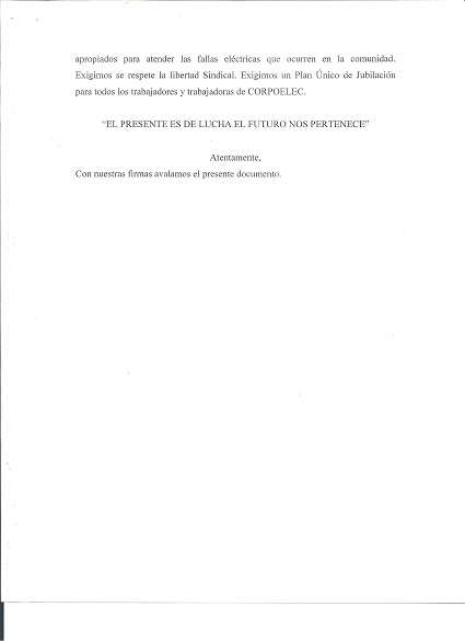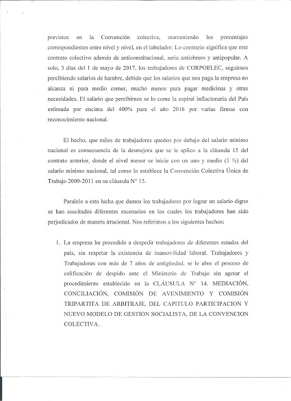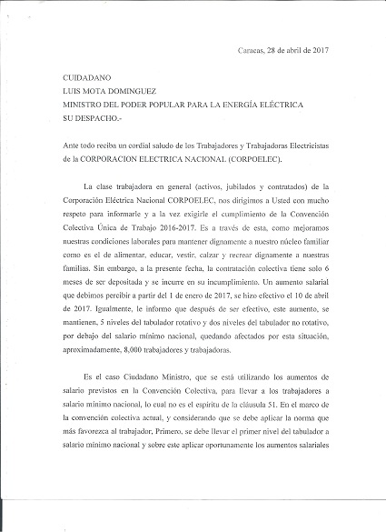 Una representación nacional del Movimiento de los Trabajadores Eléctricos se presentó el 28 de Abril en la sede principal de CORPOELEC Corporación Eléctrica Nacional. El objetivo de esa representación era consignar un documento al ciudadano Luis Mota Domínguez, Ministro del Poder Popular para la Energía Eléctrica, donde se expone la problemática actual y exige el cumplimiento de la Convención Colectiva Única de Trabajo 2016-2017.