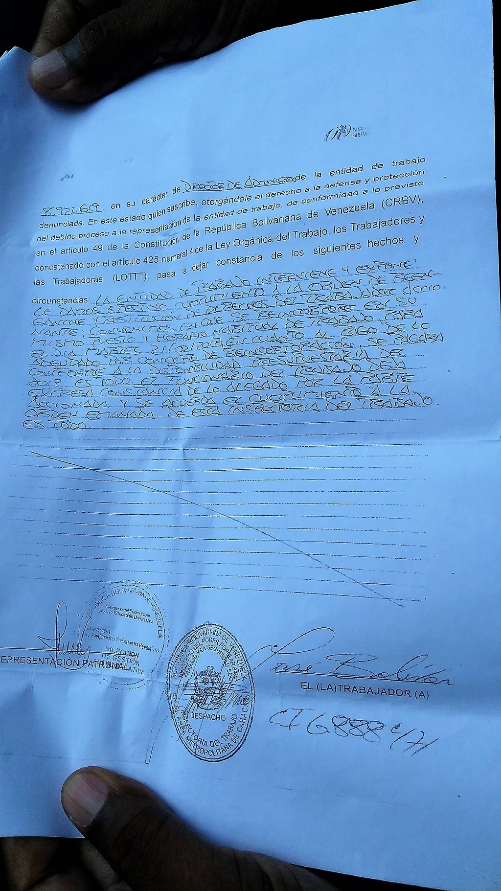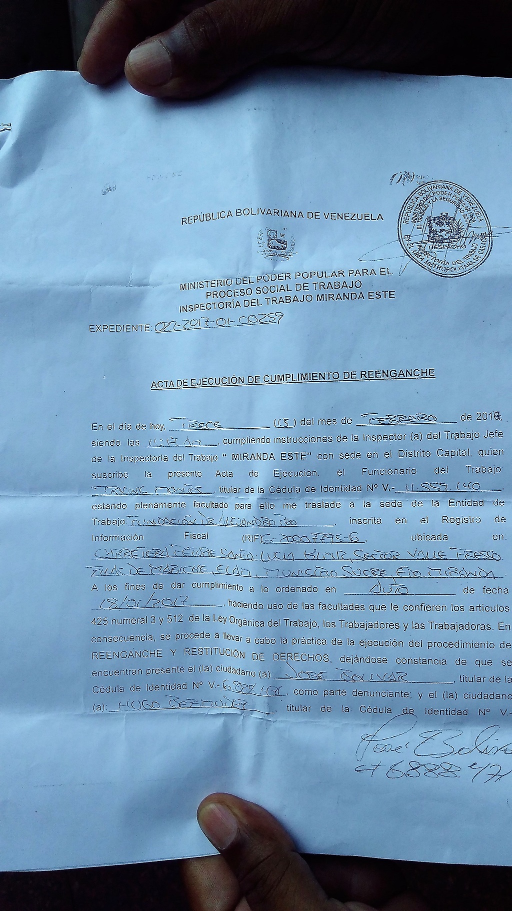 Raymaris Guedez, Ateno Ugueto Rodríguez y José Luís Bolivar, integrantes del grupo de despedidos, contaron que "sorpresivamente, sin previo aviso" les fueron entregadas cartas de despido a través del personal de seguridad de la institución. "No nos llamaron a ninguna reunión, ni hubo ninguna explicación posterior, fue un despido arbitrario... por lo que acudimos a la Inspectoría del Trabajo y obtuvimos un Amparo Laboral bajo declaración de inamovilidad laboral para todos".
