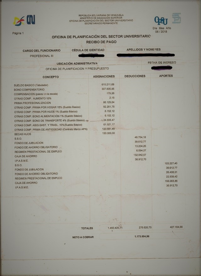 El sueldo básico (por Tabulador) de un trabajador luce absolutamente ridículo, con 615.211,69 según un recibo de pago de la Oficina de Planificación y Presupuesto de la OPSU (Oficina de Planificación del Sector Universitario, adscrita al CNU, con fecha de junio de 2018. Con la sumatoria de todos los bonos, compensaciones, becas y primas, menos los descuentos, el monto a cobrar aparece en dicho recibo en 1.173.804,96 (menos de 2 millones de bolívares), lo que en términos porcentuales equivale al cero por ciento en el marco de la hiperinflación venezolana y en relación con los valores extraoficiales calculados para la Canasta Básica, que según el CENDA están por encima de los 300 millones de bolívares mensuales (no se conocen cálculos oficiales del valor de dicha canasta a pesar de que es colocada como referencia del salario mínimo por el Art. 91 de la Constitución).