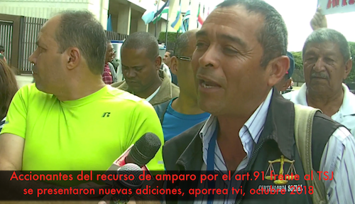 Jueves, 25 de octubre de 2018.- El miércoles 24 de octubre, Gonzalo Gómez y Carlos Paredes, accionantes del recurso de amparo en solicitud de que se proteja y se restituya el artículo 91 de la Constitución de la República Bolivariana de Venezuela, dieron frente al Tribunal Supremo de Justicia y junto a un grupo de trabajadores y dirigentes sindicales, unas declaraciones a la prensa, relacionadas al mencionado recurso.