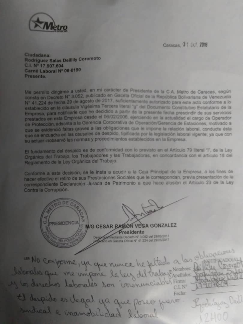 Exigieron reenganche inmediato de la trabajadora y sindicalista, que reclama haber sido objeto de despido arbitrario, violentando sus garantías legales, luego de emitir declaraciones (en su tiempo libre) para medios de comunicación, sobre la situación salarial y laboral y sobre el deterioro del servicio de transporte del Metro que afecta a la ciudadanía.