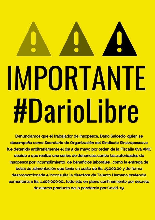 Darío Salcedo, trabajador de INSOPESCA, secretario de organización del sindicato SINSTRAPESCAVE fue detenido el pasado 05 de mayo de este 2020 por orden de la Fiscalía 8va AMC, luego de haber realizado denuncias contra las autoridades de dicha institución por incumplimiento de beneficios laborales.