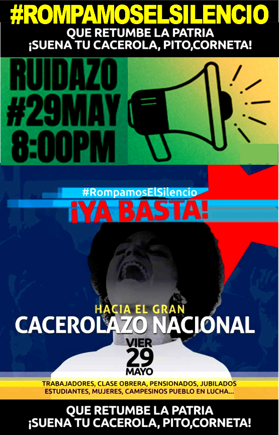 Por parte de las anteriores razones Convocan a un Tuitazo Nacional que unifique la protesta social en torno a la consigna #RompamosElSilencio para el día Jueves a las 7:00 pm y un gran Cacerolazo Nacional para el Viernes 29 de Mayo a las 8:00 pm que levante el grito de protesta del Pueblo Venezolano.