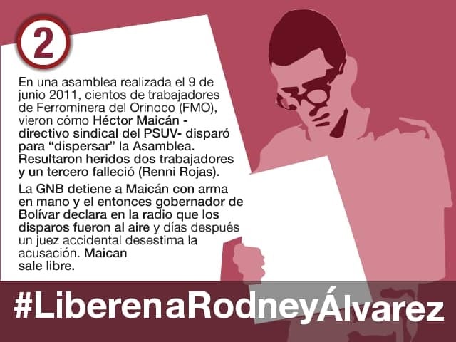 Expone Aguilera, en un texto recibido por Aporrea, que eL 11 de junio de 2011, el juzgado segundo de control , extensión Puerto Ordaz, a cargo de Carlos Oronó, realizó la audiencia de presentación del dirigente sindical de la empresa estatal "Ferrominera del Orinoco" Rodney Alvarez, a quien el Ministerio Público lo responsabilizó de la comisión del delito de homicidio intencional contra el trabajador de la misma empresa Renny Rojas, cuyo fallecimiento ocurrió el 9 del mismo mes en las inmediaciones de la empresa, como consecuencia de haber recibido una herida por arma de fuego, que según la defensa y el testimonio de numerosos testigos, fue "producida por el dirigente sindical de PSUV , Hector Maican, al momento de realizar la asamblea general de trabajadores con la finalidad de elegir la junta electoral que dirigiría los comicios electorales para la escogencia de la nueva junta directiva del sindicato de trabajadores (SINTRAFERROMINERA)".