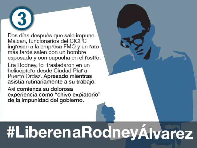 Sin embargo, en esta misma fecha, el investigado Rodney Alvarez, quedó privado de libertad, recluido en la cárcel de Guaiparo del estado Bolívar. De acuerdo con el relato del abogado que atiende el caso, a partir de allí, los órganos de la administración de justicia habrían actuado en una misma línea contra este dirigente sindical, con "dos propósitos elementales: El primero sembrar el terror y el desánimo en la clase trabajadora venezolana opositora al gobierno, y el segundo propósito, coaccionar al procesado para que admitiera los hechos, por lo cual, quedaría exento de toda responsabilidad judicial Héctor Maican".