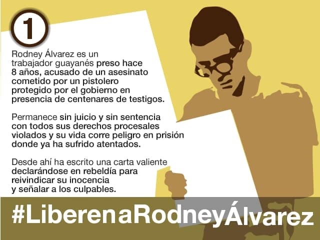 Abog Luis Aguilera denuncia que el trabajador Rodney Álvarez lleva nueve años secuestrado por el Estado venezolano, quien a continuación ofrece el fundamento de dicha afirmación. Según su relato, Rodney Alvarez estaría pagando un crimen de otro ciudadano, quien habria cometido homicidio a la vista de una asamblea obrera en Ferrominera del Orinoco, en el estado Bolívar.