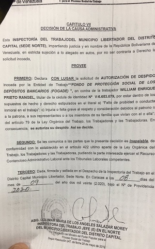 El pasado 30 de septiembre a través de redes sociales como twitter, el trabajador y dirigente sindical de FOGADE, William Prieto, dio a conocer su despido laboral por parte de las autoridades de dicho Instituto, encabezado por Arlen Piñate, hija del actual ministro del trabajo, Eduardo Piñate.