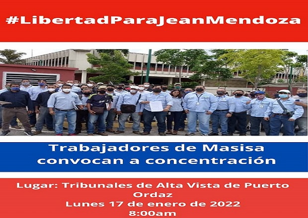 Trabajadores de MASISA (transnacional maderera en Guayana) que inicialmente había convocado a concentrarse este lunes en el lugar de detención del dirigente obrero Jean Mendoza ante el CICPC de San Félix han notificado el cambio de la convocatoria para los Tribunales de Alta Vista a las 8 AM, en Puerto Ordaz, al tener confirmación de que será presentado allí este lunes 17 de enero.
