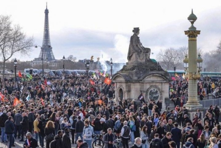 18-03-23.-Tras la firma de Macron del decreto que habilita la reforma previsional, se organizaron marchas y actos por toda Francia. En París, varios miles de manifestantes acudieron en masa a la Plaza de la Concordia, frente a la Asamblea Nacional, mientras el Gobierno dispuso un fuerte operativo policial que terminó reprimiendo a los manifestantes.