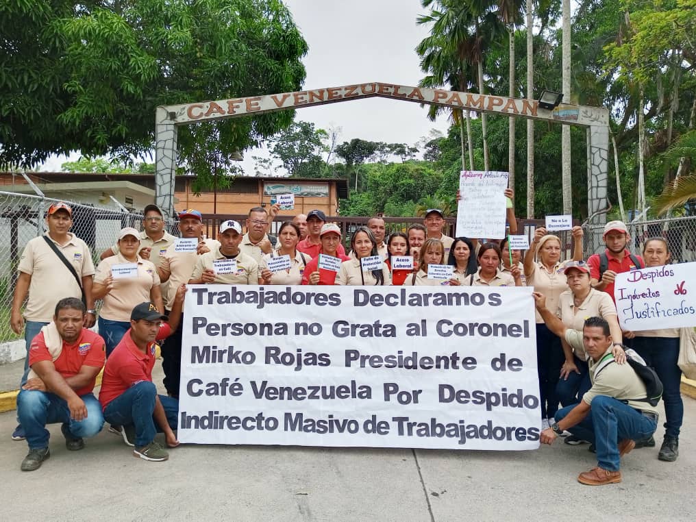 Las trabajadoras y trabajadores se han tenido que plantar con pancartas a las puertas de las intalaciones porque ni les dejan entrar, ni sale algún gerente o responsable de la empresa a dar explicaciones, a escuchar las quejas y las angustias. Portazo y vuelta de espaldas es el trato que indigna a la masa laboral. En su pancarta principal declaran "persona no grata" al coronel Mirko Rojas, presidente de Café Venezuela por el "despido indirecto masivo" aplicado contra los trabajadores.