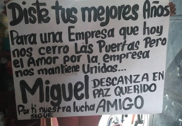 Cartel mostrado por sus compañeros trabajadores, dolidos por el fallecimiento del obrero