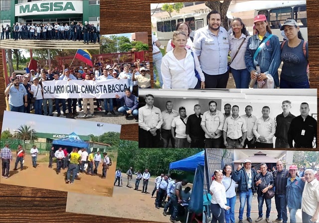 Collage de fotos con movilizaciones de los trabajadores de Masisa, Jean Mendoza con la plancha presentada para las elecciones de SITRAEMAS, imágenes de trabajadores en torno a los toldos y mesas de votación, y acompañamiento solidario de trabajadores y trabajadoras de otros sectores (jubilados, empresas de la CVG, etc)