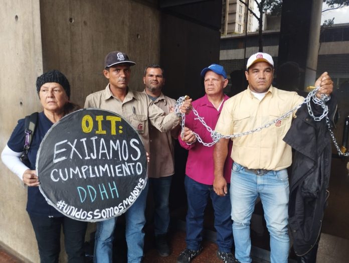 05-10-23.-Un grupo de trabajadores de la estatal Ferrominera del Orinoco, situada en el estado Bolívar, se encadenó este 4 de octubre a las puertas de la Defensoría del Pueblo, en Caracas.