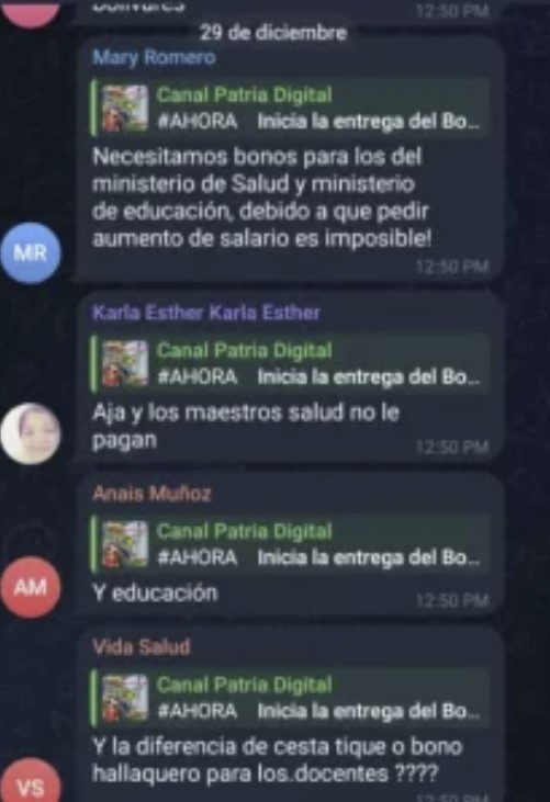 30-12-23.-La noticia del pago del bono Cuadrantes de Paz a funcionarios de seguridad del Estado por un monto de casi 50 dólares enfureció a educadores del país, quienes expresaron su descontento a través de la mensajería en el canal Patria Digital de Telegram la mañana de este viernes 29 de diciembre.