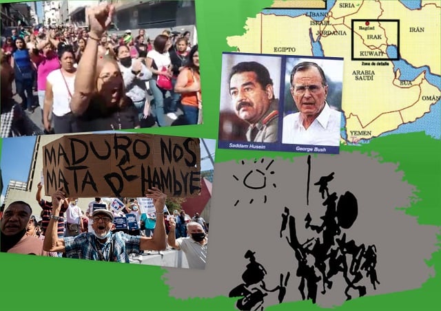 22. En 1991, el presidente ce los EE.UU, George Bush, ordena el comienzo de la II Guerra del Golfo con la operación «Tormenta del Desierto». Da inicio de los bombardeos aéreos sobre Bagdad y al conflicto bélico en Irak, con el uso de una fuerza de coalición "autorizada" por la ONU, compuesta por 34 países y encabezada por Estados Unidos. Como justificación del hecho se argumentó la respuesta a la invasión y anexión iraquí de Kuwait. Fue posterior a la guerra entre Irán e Irak (1980-1988) y anterior a la guerra de Irak de 2003-2011. Aunque las tropas de los EEUU se han retirado, sigue habiendo operaciones ocasionales de la potencia imperialista en Irak, como algún bombardeo, ataques con drones y misiles, o asesinatos de líderes.