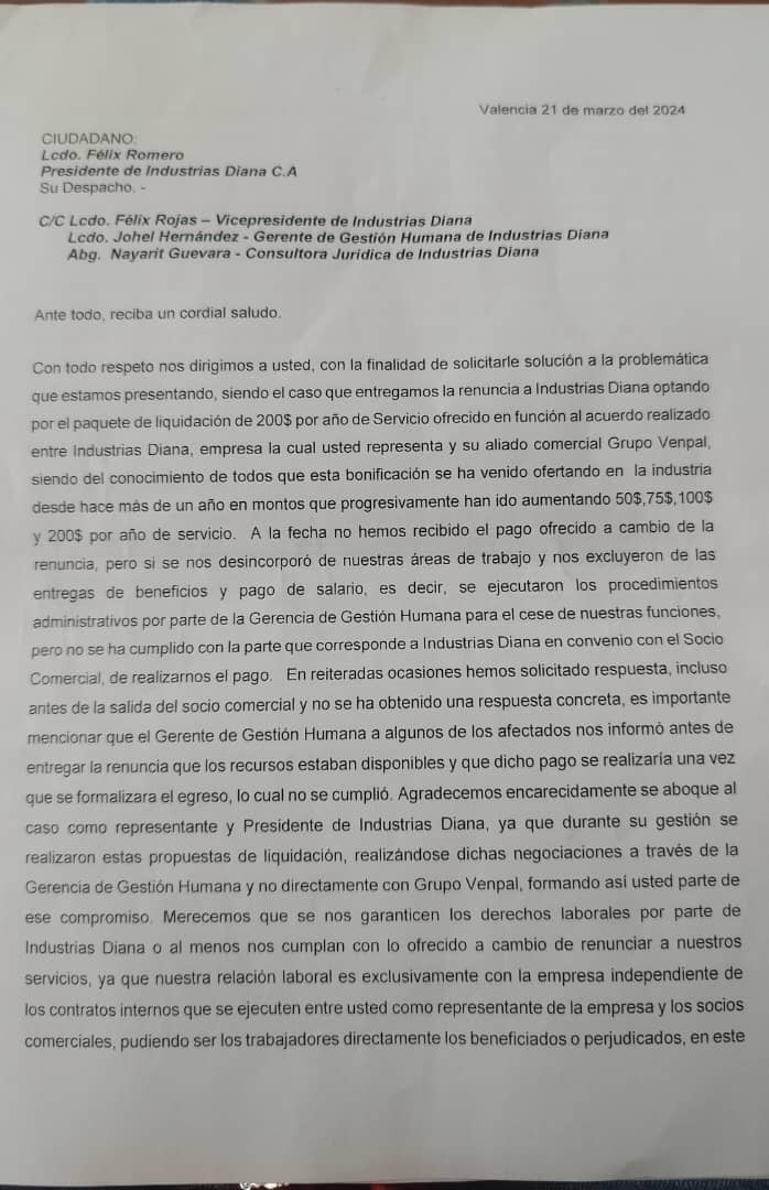 27 de abril de 2024.- Un grupo de trabajadores de Industrias Diana en el estado Carabobo se han dirigido a esta redacción con la finalidad de realizar la denuncia.