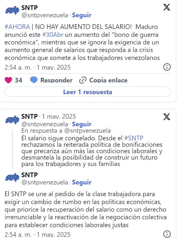 Ante esto, SNTP, señaló en su cuenta de la red social X: "No hay aumento de salario. Maduro anunció, este 30 de abril, un aumento del «bono de guerra económica", mientras que se ignora la exigencia de un aumento general de salarios que responda a la crisis económica que somete a los trabajadores venezolanos.