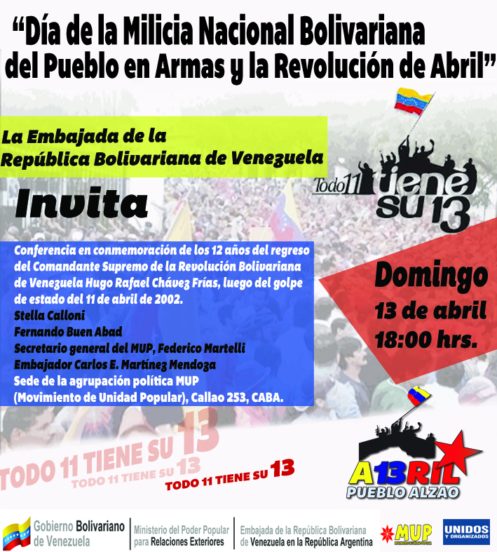Los jóvenes, que no vivieron el 13 de abril, cuentan, para avivar su ser revolucionario su pensamiento y su memoria, con el alma simbólica vigorosa que habita en cada una de las acciones revolucionarias en la construcción magnífica de viviendas, de hospitales, de escuelas de emancipación laboral de cultura revolucionaria y de comunicación socialista. Los adultos que forjaron el 13 de abril, hermanados por las luchas históricas de la Revolución Bolivariana, tienen la tarea suprema de hacer comunicación histórica cotidiana, creativa y personalizada, para que el 13 de abril de cada día, se afiance como fuerza y como mandato del mundo nuevo que está en plena construcción.