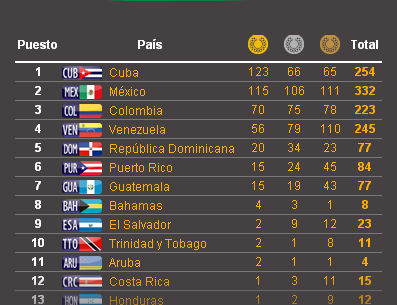 Como se puede ver en la tabla, ese "pobre" país llamado Cuba duplica en medallas de oro a Colombia y Venezuela y ocupa el primer lugar superando a México aún cuando éste es país anfitrión. Ahora veremos a nuestros dirigentes deportivos magnificar los logros deportivos de nuestros muchachos y muchachas en la justa deportiva para ocultar lo que a la vista de los resultados resalta odiosamente: un país "bloqueado" desde hace más de50 años y otro con una guerra interna también de más de 50 años nos superan en logros deportivos, ¿Por qué?