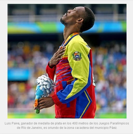Luis Paiva, ganador de medalla de plata en los 400 metros de los Juegos Paralímpicos de Río de Janeiro, es oriundo de la zona cacaotera del municipio Páez.