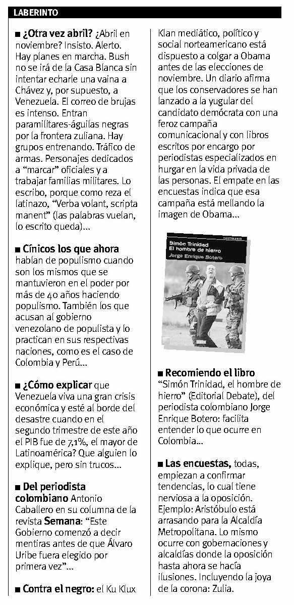 Pero la pobreza argumental de la oposición -inspirada en el odio, en el desprecio por los logros venezolanos- revela su inaudita dimensión cuando incurre en la torpeza de emplear el término "diplomacia petrolera" para atribuirle a la actual política exterior el propósito subalterno de comprar solidaridades en el mundo. Ante todo se trata de un señalamiento ofensivo contra dirigentes políticos, sociales, culturales, académicos, jefes de Estado, parlamentarios y partidos políticos de otras latitudes. Simplemente se afirma que quien mantenga buenas relaciones con Venezuela, aquellas naciones que comercien, los dirigentes que apoyen el proceso bolivariano, que están identificados con él, lo hacen porque son mercenarios. Ya este miserable señalamiento provocó la reacción en Montevideo de los parlamentarios de Mercosur, y obligó al alcalde itinerante, Leopoldo López, a excusarse.