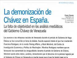 El artículo “La demonización de Chávez en España”, escrito por Navarro, muestra la manera sesgada como el economista Francisco Rodríguez, de la revista Foreing Affaire, aborda el tema venezolano y cómo es rebatida por el investigador Mark Weisbrot, del Centro de Investigación Económica y Política de Washington, con argumentos concretos y respetando una metodología de trabajo.
